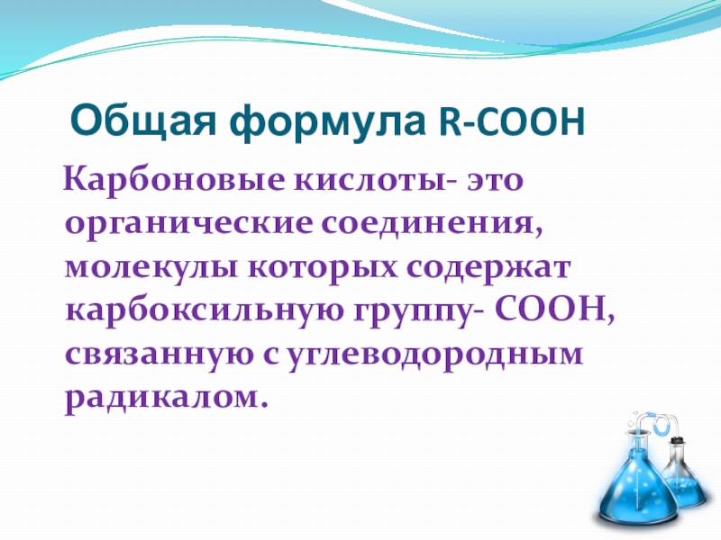 Общая формула R-COOH Карбоновые кислоты- это органические соединения, молекулы которых содержат карбоксильную группу- СООН, связанную