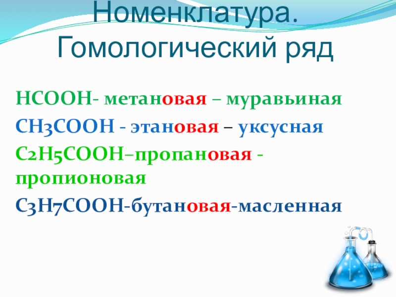 Номенклатура. Гомологический рядНСООН- метановая – муравьинаяСН3СООН - этановая – уксуснаяС2Н5СООН–пропановая -пропионоваяС3Н7СООН-бутановая-масленная