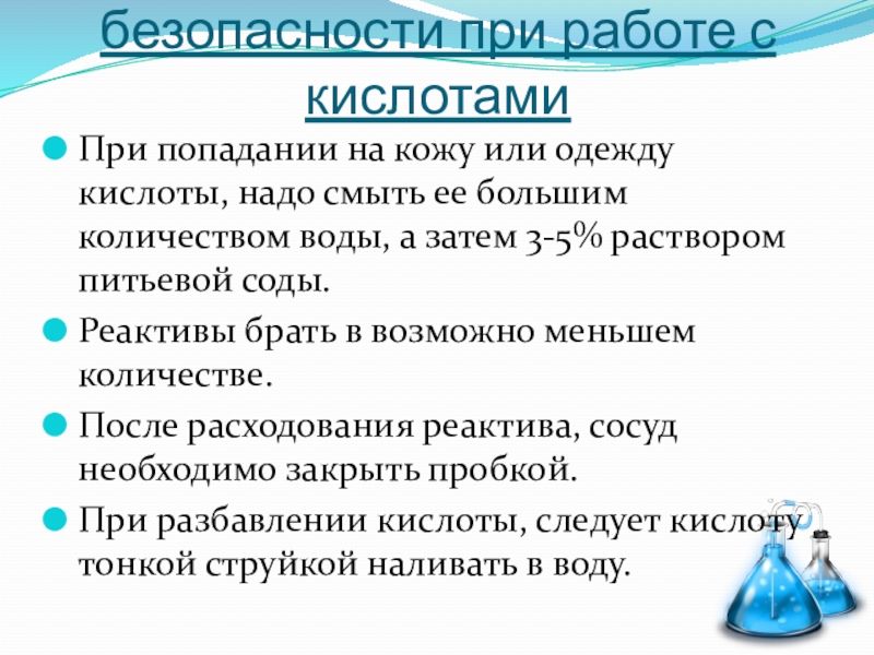 Слайд 7Правила техники безопасности при работе с кислотами