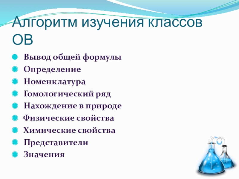 Алгоритм изучения классов ОВ Вывод общей формулы Определение Номенклатура Гомологический ряд Нахождение в природе Физические свойства Химические свойства Представители Значения