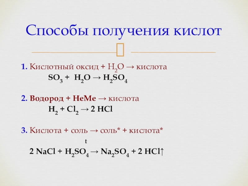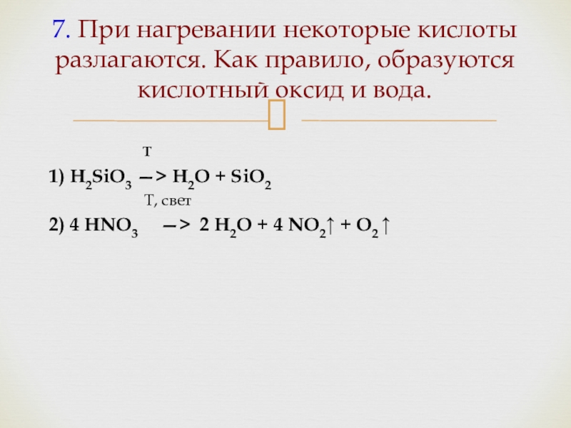 7. При нагревании некоторые кислоты разлагаются. Как правило, образуются кислотный оксид и вода.