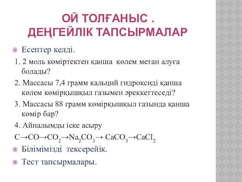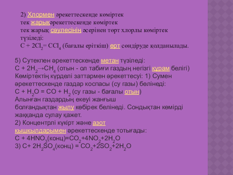 2) Хлормен әрекеттескенде көміртек тек жарықәрекеттескенде көміртек тек жарық сәулесінің әсерінен төрт хлорлы көміртек түзіледі: