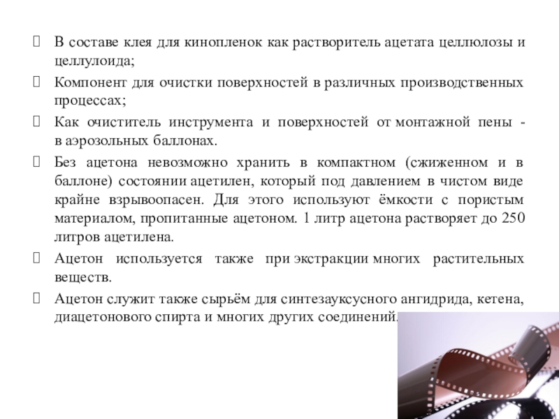 Слайд 7В составе клея для кинопленок как растворитель ацетата целлюлозы и целлулоида;