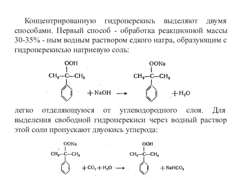 Слайд 12Концентрированную гидроперекись выделяют двумя способами. Первый способ - обработка реакционной массы