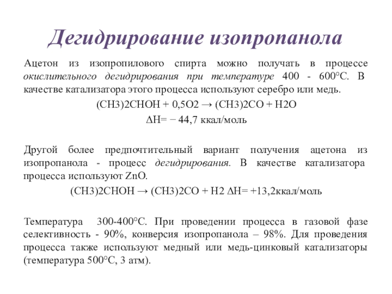 Температура 300-400°С. При проведении процесса в газовой фазе селективность - 90%, конверсия изопропанола – 98%. Для проведения процесса также используют медный или медь-цинковый катализаторы(температура 500°С, 3 атм).