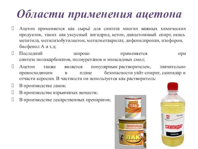 Ацетон применяется как сырьё для синтеза многих важных химических