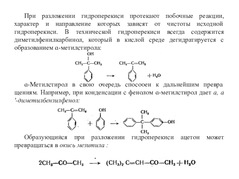 Слайд 13При разложении гидроперекиси протекают побочные реакции, характер и направление которых зависят