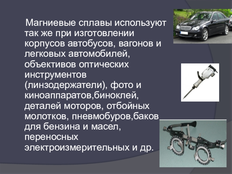 вагонов и легковых автомобилей, объективов оптических инструментов (линзодержатели), фото и киноаппаратов,биноклей, деталей моторов, отбойных молотков, пневмобуров,баков для бензина и масел, переносных электроизмерительных и др.