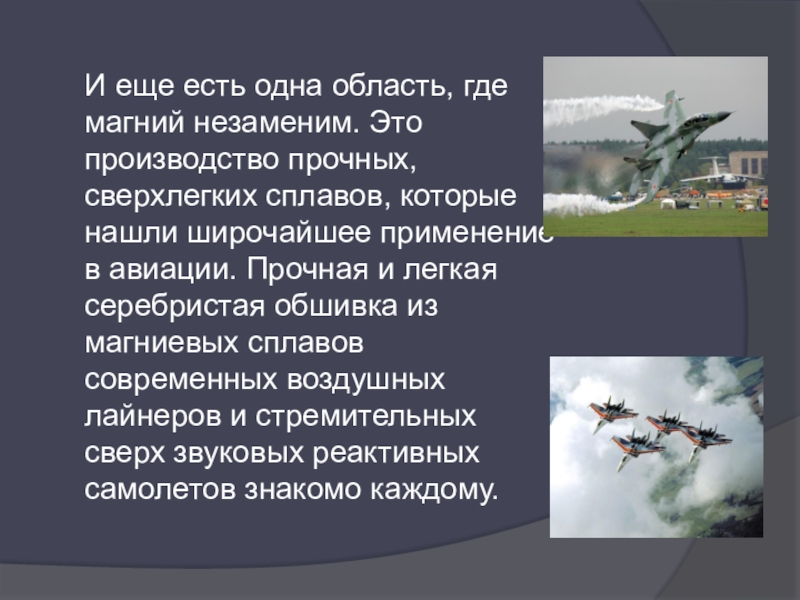 производство прочных, сверхлегких сплавов, которые нашли широчайшее применение в авиации. Прочная и легкая серебристая обшивка из магниевых сплавов современных воздушных лайнеров и стремительных сверх звуковых реактивных самолетов знакомо каждому.