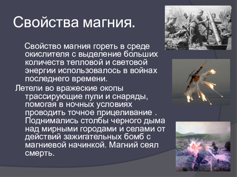 Летели во вражеские окопы трассирующие пули и снаряды, помогая в ночных условиях проводить точное прицеливание .Поднимались столбы черного дыма над мирными городами и селами от действий зажигательных бомб с магниевой начинкой. Магний сеял смерть.