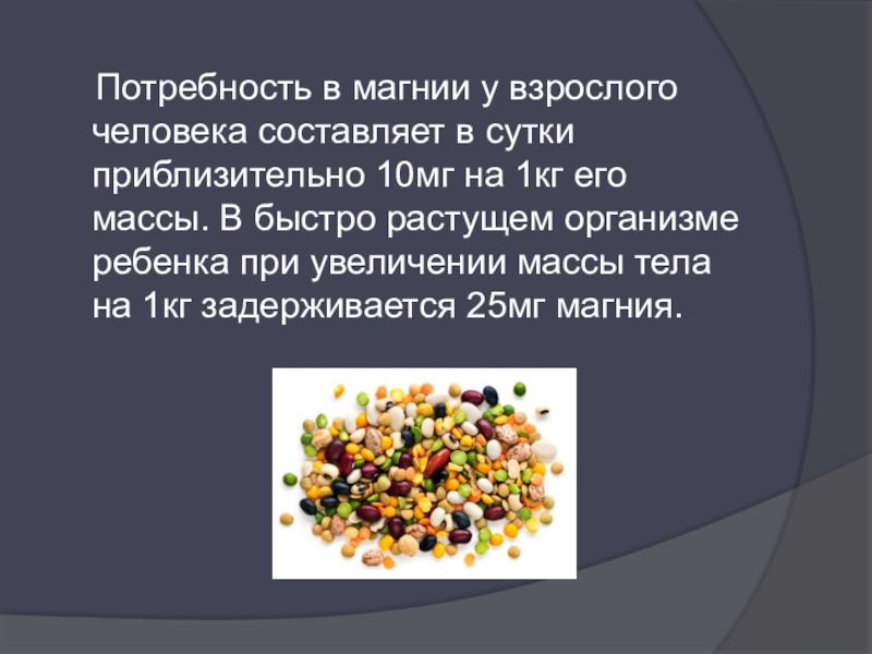 Слайд 11 Потребность в магнии у взрослого человека составляет в сутки