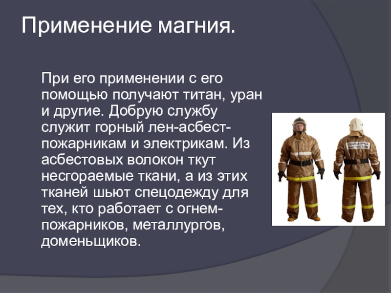 уран и другие. Добрую службу служит горный лен-асбест-пожарникам и электрикам. Из асбестовых волокон ткут несгораемые ткани, а из этих тканей шьют спецодежду для тех, кто работает с огнем-пожарников, металлургов, доменьщиков.