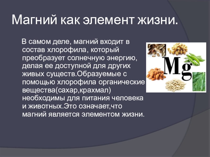 состав хлорофила, который преобразует солнечную энергию, делая ее доступной для других живых существ.Образуемые с помощью хлорофила органические вещества(сахар,крахмал)необходимы для питания человека и животных.Это означает,что магний является элементом жизни.