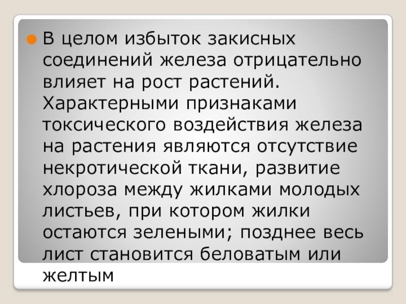 Слайд 23В целом избыток закисных соединений железа отрицательно влияет на рост растений.