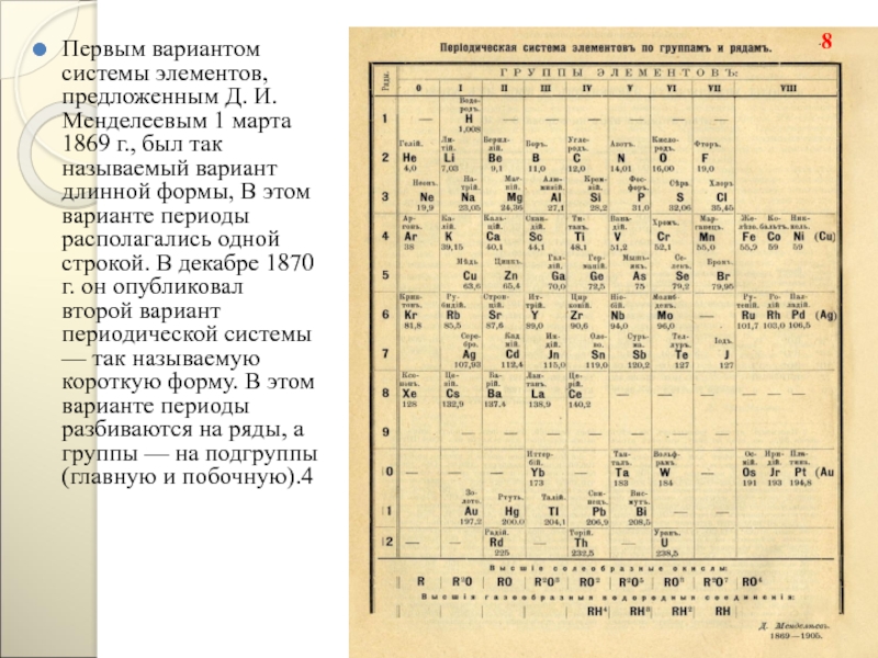 Слайд 8Первым вариантом системы элементов, предложенным Д. И. Менделеевым 1 марта 1869