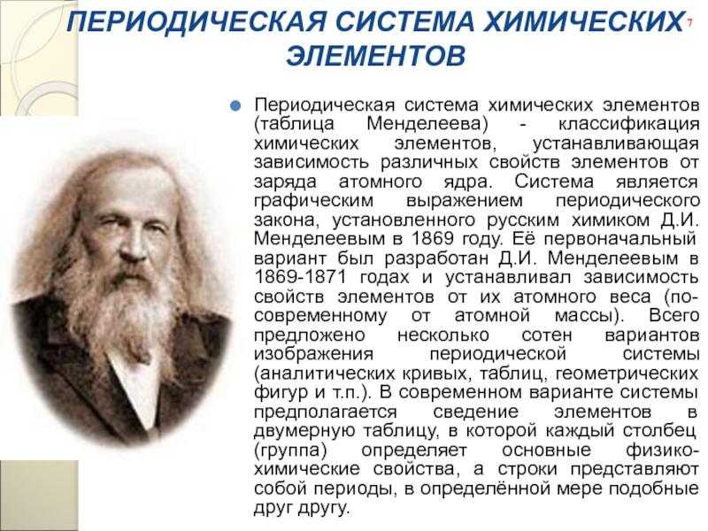 химических элементов, устанавливающая зависимость различных свойств элементов от заряда атомного ядра. Система является графическим выражением периодического закона, установленного русским химиком Д.И. Менделеевым в 1869 году. Её первоначальный вариант был разработан Д.И. Менделеевым в 1869-1871 годах и устанавливал зависимость свойств элементов от их атомного веса (по-современному от атомной массы). Всего предложено несколько сотен вариантов изображения периодической системы (аналитических кривых, таблиц, геометрических фигур и т.п.). В современном варианте системы предполагается сведение элементов в двумерную таблицу, в которой каждый столбец (группа) определяет основные физико-химические свойства, а строки представляют собой периоды, в определённой мере подобные друг другу.