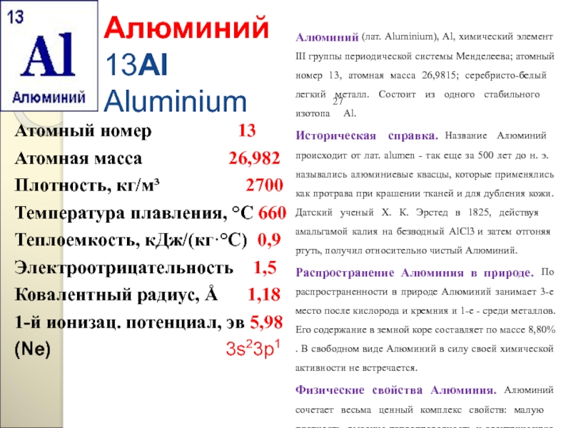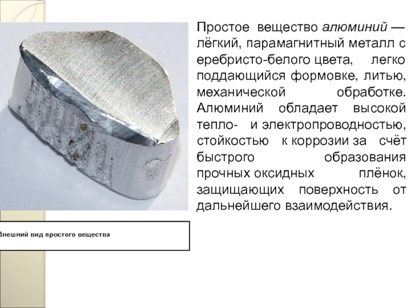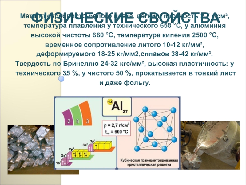 Металл серебристо-белого цвета, легкий, плотность 2,7 г/см³, температура плавления у