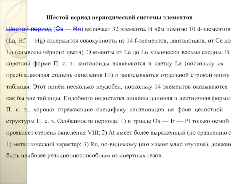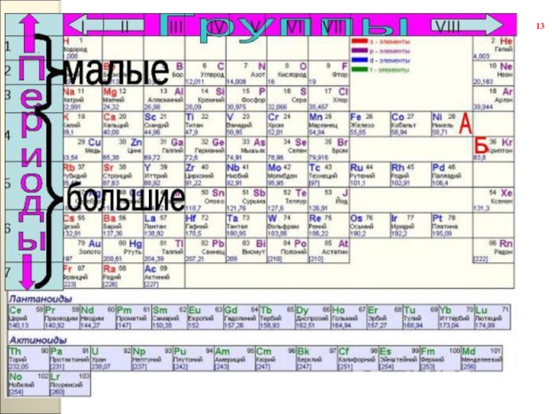 Периоды разделяют на малые (1 – 3) и большие (4 – 7). Малые периоды состоят из одного горизонтального ряда. Большие периоды состоят из двух горизонтальных рядов. Верхние ряды больших периодов называются четными, нижние ряды — нечетными. В шестом периоде после лантана (Z = 57) находятся 14 элементов (Z = 58 – 71), которые похожи по свойствам на лантан и называются лантоноидами. Они располагаются в нижней части периодической системы.
