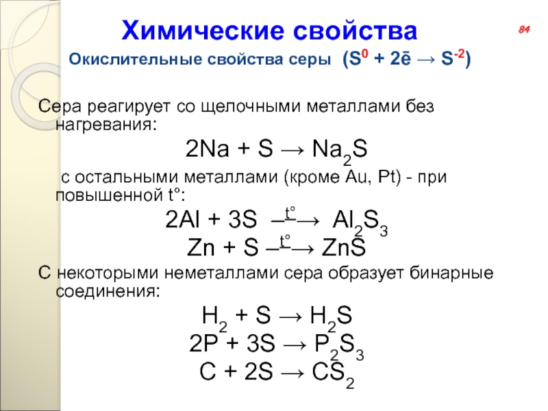 Бериллий и магний реагируют с кислородом и серой при нагревании, остальные металлы - при обычных условиях.