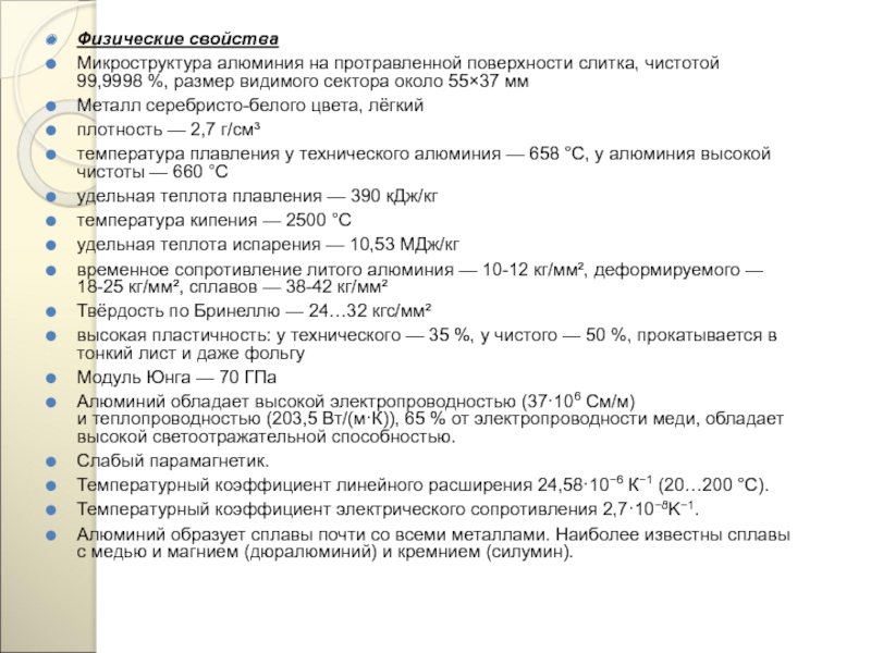 технического 658 °C, у алюминия высокой чистоты 660 °C, температура кипения 2500 °C, временное сопротивление литого 10-12 кг/мм², деформируемого 18-25 кг/мм2,сплавов 38-42 кг/мм².