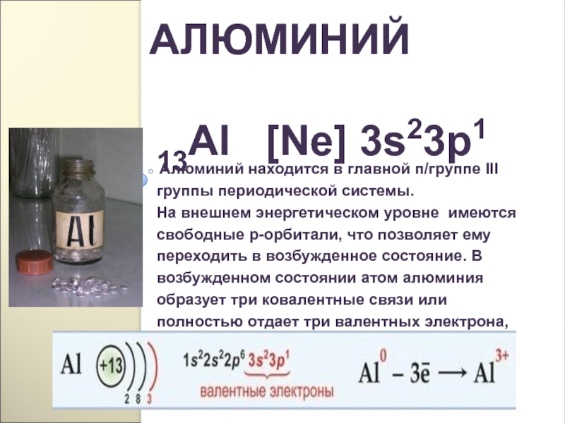 На внешнем энергетическом уровне имеются свободные р-орбитали, что позволяет ему переходить в возбужденное состояние. В возбужденном состоянии атом алюминия образует три ковалентные связи или полностью отдает три валентных электрона, проявляя степень окисления +3.