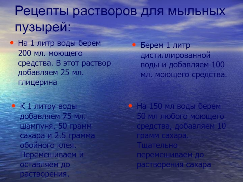 К 1 литру воды добавляем 75 мл. шампуня, 50 грамм сахара и 2.5 грамма обойного клея. Перемешиваем и оставляем до растворения.