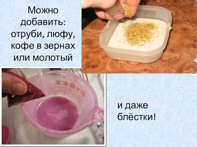 Слайд 8Можно добавить: отруби, люфу, кофе в зернах или молотый