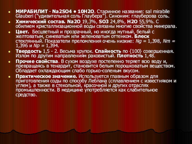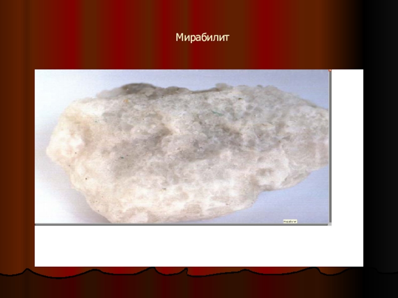 Слайд 17МИРАБИЛИТ - Na2SO4 • 10H2O. Старинное название: sal mirabile Glauberi ("удивительная