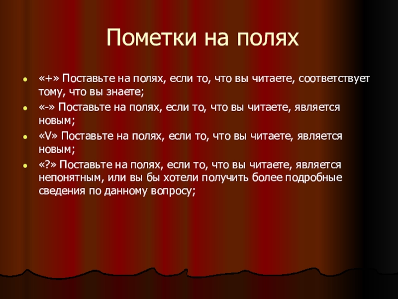 «?» Поставьте на полях, если то, что вы читаете, является непонятным, или вы бы хотели получить более подробные сведения по данному вопросу;