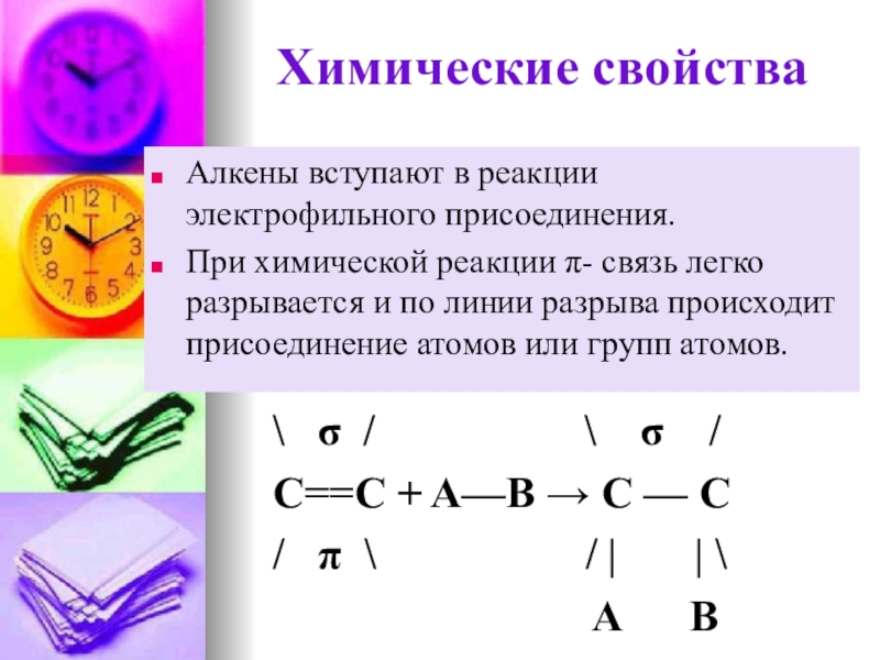 При химической реакции π- связь легко разрывается и по линии разрыва происходит присоединение атомов или групп атомов.