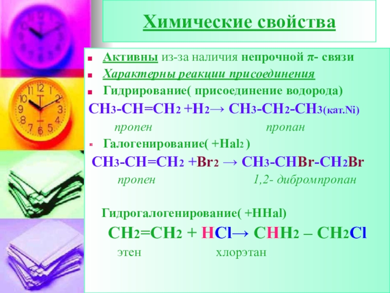 СН3-СН=СН2 +Н2→ CH3-CH2-CH3(кат.Ni)