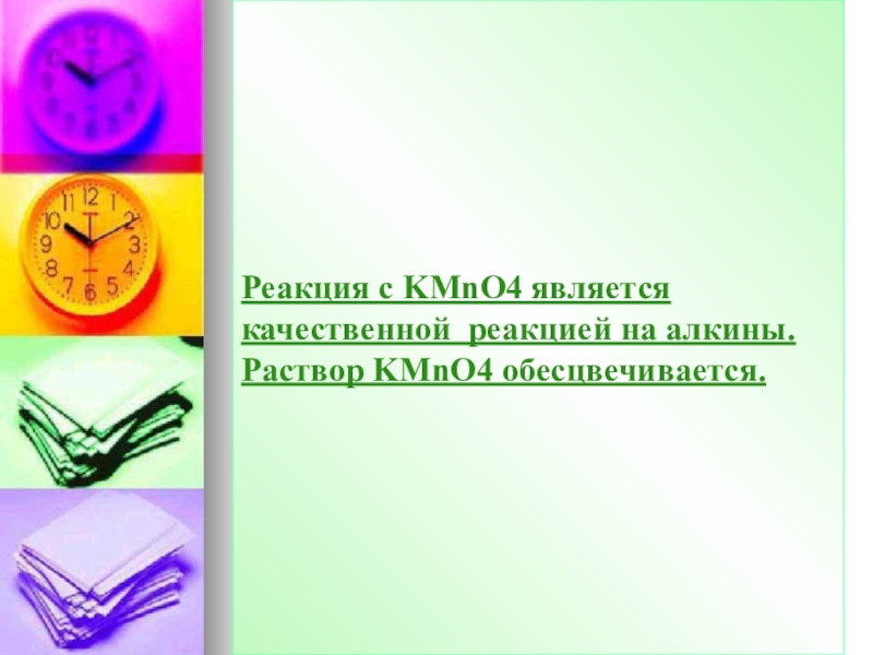 Слайд 47Реакция с KMnO4 является качественной реакцией на алкины. Раствор KMnO4 обесцвечивается.