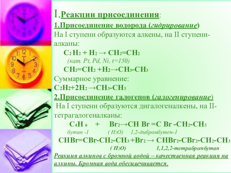 Реакция алкинов с бромной водой – качественная реакция на алкины. Бромная вода обесцвечивается.