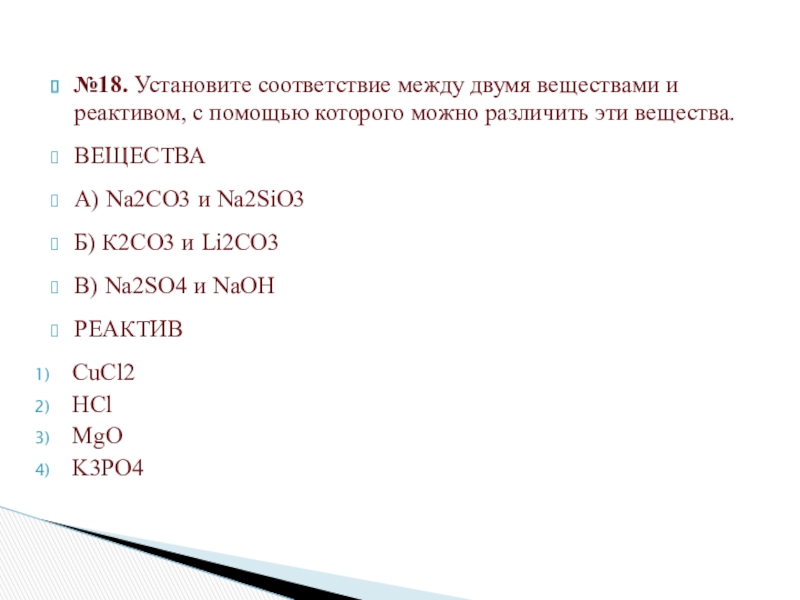 Слайд 4№18. Установите соответствие между двумя веществами и реактивом, с помощью которого