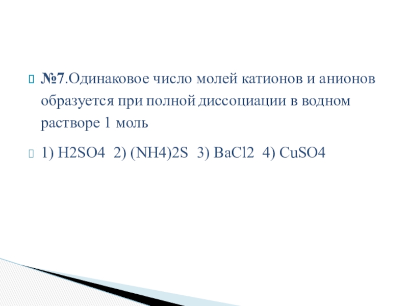 Слайд 2№7.Одинаковое число молей катионов и анионов образуется при полной диссоциации в