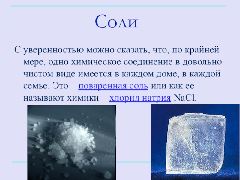 С уверенностью можно сказать, что, по крайней мере, одно химическое соединение в довольно чистом виде имеется в каждом доме, в каждой семье. Это – поваренная соль или как ее называют химики – хлорид натрия NaCl.