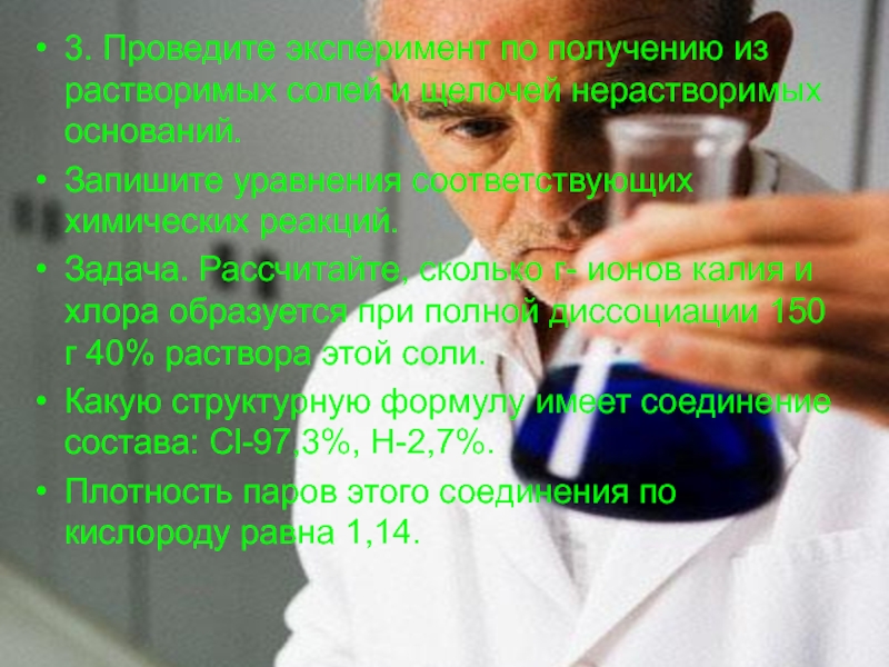 Слайд 193. Проведите эксперимент по получению из растворимых солей и щелочей нерастворимых