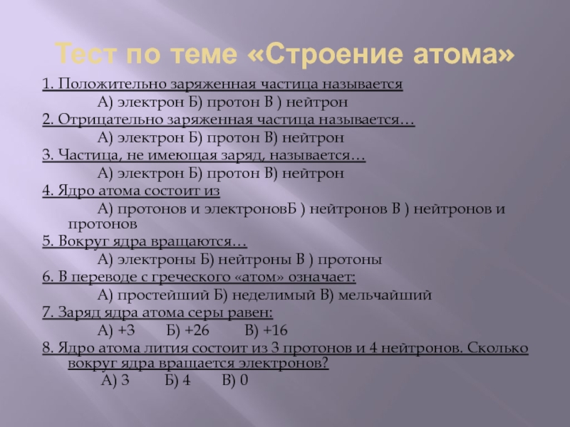 Атом электронейтрален, так как содержит одинаковое число протонов и электронов, равное порядковому номеру элемента