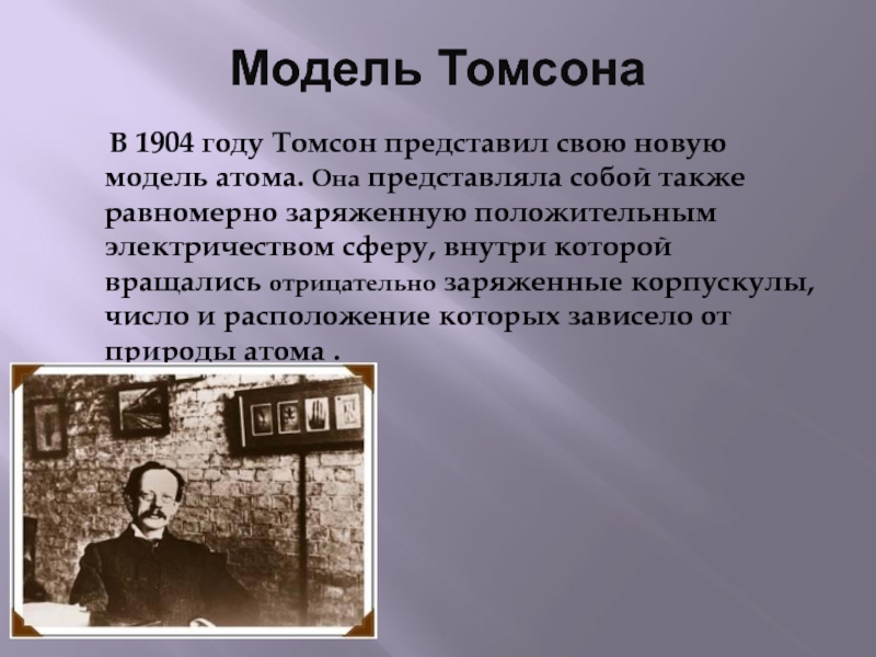 модель атома. Она представляла собой также равномерно заряженную положительным электричеством сферу, внутри которой вращались отрицательно заряженные корпускулы, число и расположение которых зависело от природы атома .
