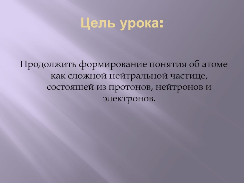 Продолжить формирование понятия об атоме как сложной нейтральной частице, состоящей