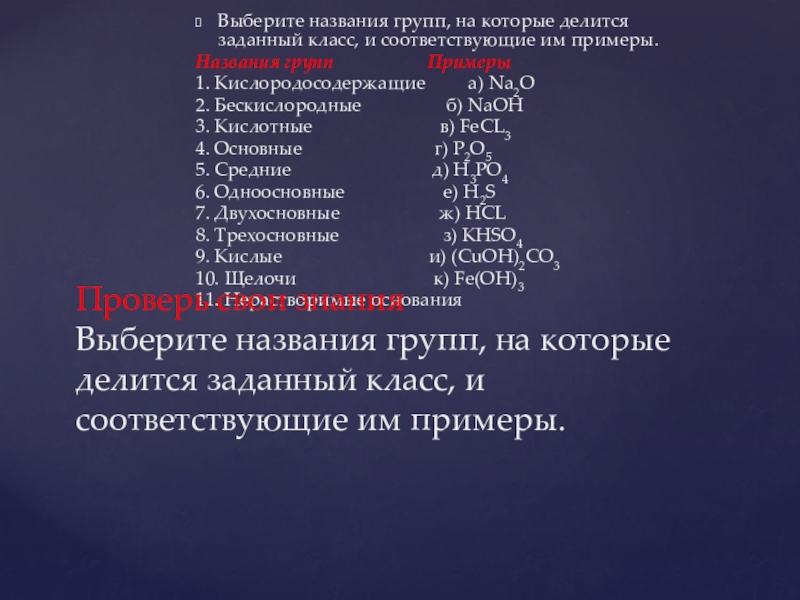 Выберите названия групп, на которые делится заданный класс, и соответствующие им примеры.