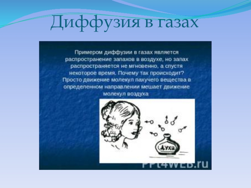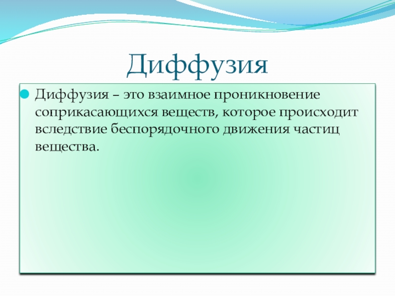 ДиффузияДиффузия – это взаимное проникновение соприкасающихся веществ, которое происходит вследствие беспорядочного движения частиц вещества.
