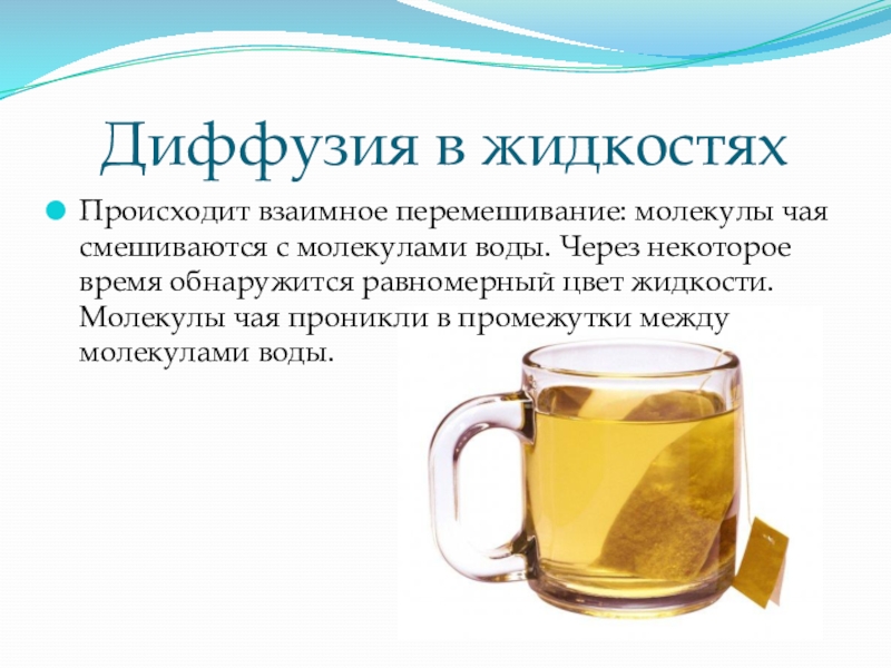 Диффузия в жидкостяхПроисходит взаимное перемешивание: молекулы чая смешиваются с молекулами воды. Через некоторое время обнаружится равномерный цвет