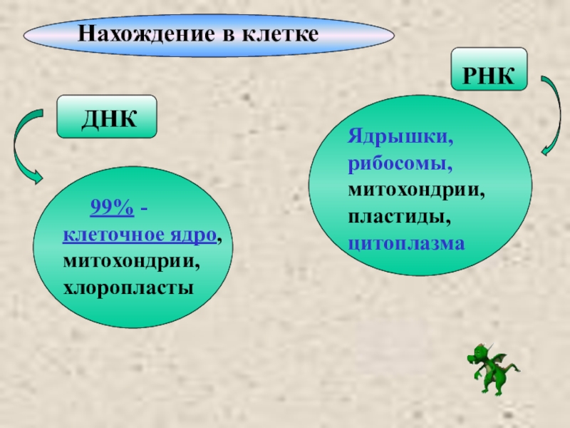 Нахождение в клетке ДНКРНК   99% - клеточное ядро, митохондрии, хлоропластыЯдрышки, рибосомы, митохондрии, пластиды,  цитоплазма