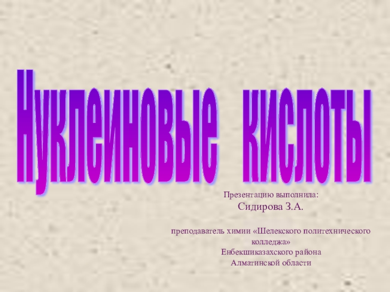 Нуклеиновые  кислоты Презентацию выполнила:Сидирова З.А.преподаватель химии «Шелекского политехнического колледжа»Енбекшиказахского районаАлматинской области