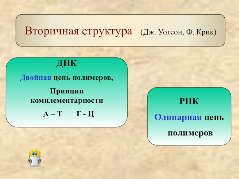 Вторичная структура  (Дж. Уотсон, Ф. Крик)ДНКДвойная цепь полимеров, Принцип комплементарности А – Т