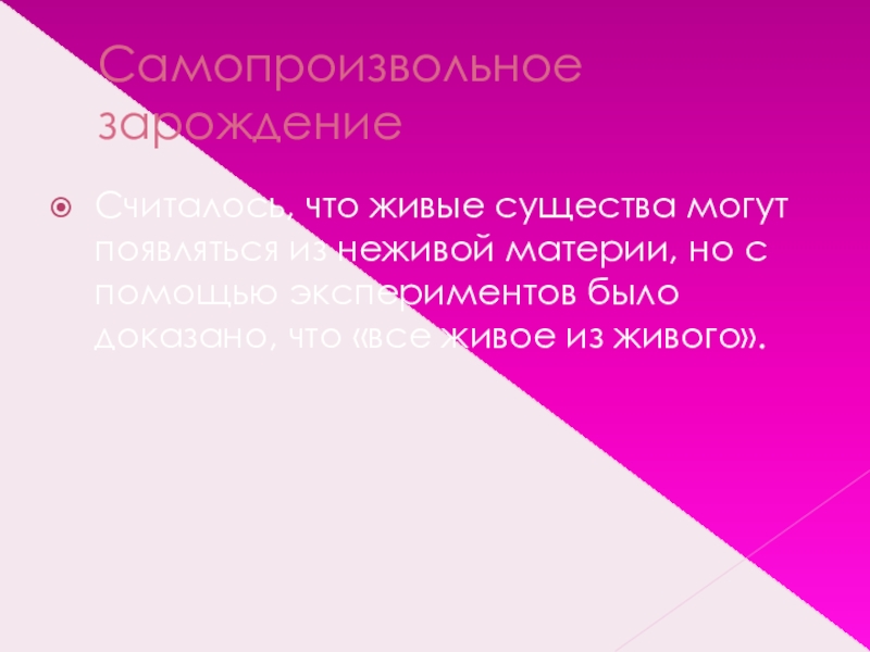 Самопроизвольное зарождениеСчиталось, что живые существа могут появляться из неживой материи, но с помощью экспериментов было доказано, что