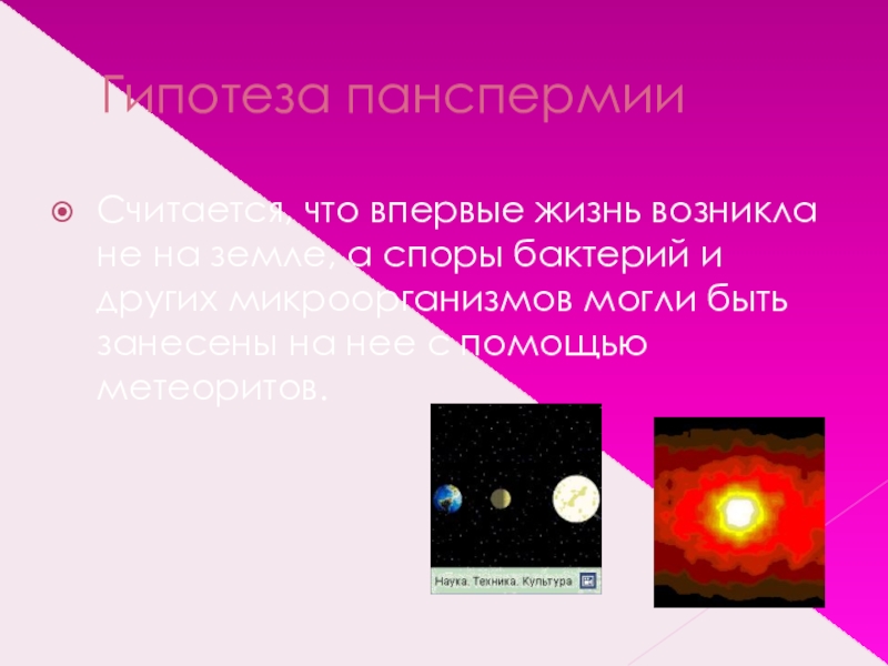 Гипотеза панспермииСчитается, что впервые жизнь возникла не на земле, а споры бактерий и других микроорганизмов могли быть
