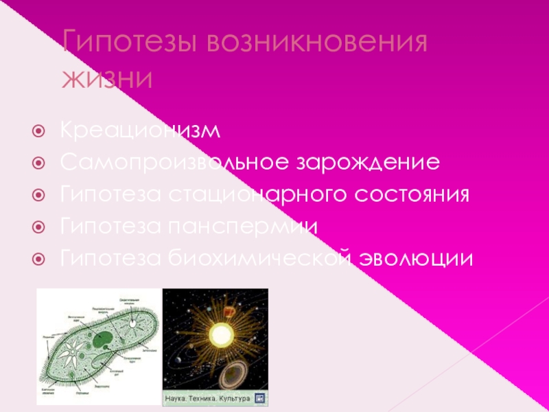 Гипотезы возникновения жизниКреационизмСамопроизвольное зарождениеГипотеза стационарного состоянияГипотеза панспермииГипотеза биохимической эволюции