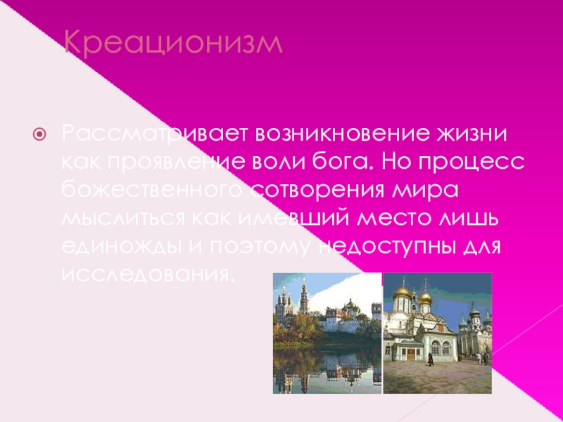 Креационизм Рассматривает возникновение жизни как проявление воли бога. Но процесс божественного сотворения мира мыслиться как имевший место